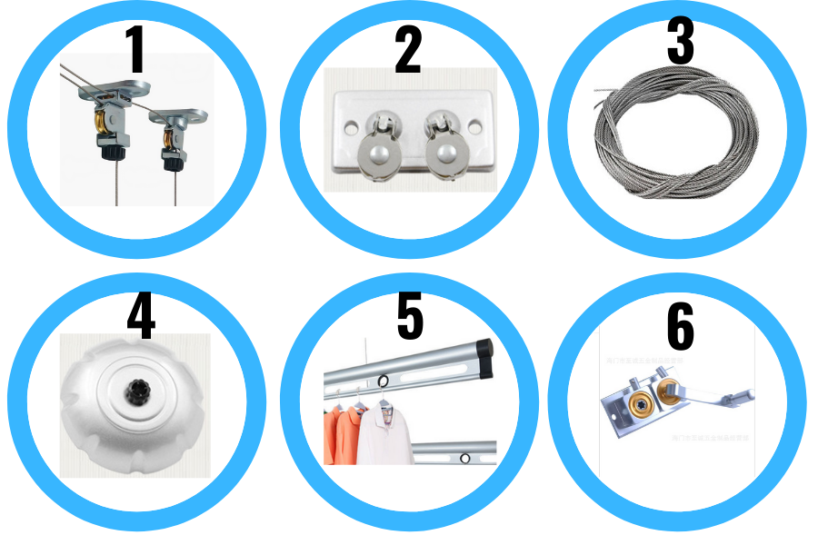 - Bộ buli: Bao gồm 2 buli đơn và 2 buli đôi, giúp hỗ trợ việc nâng hoặc hạ thanh phơi. (Xem hình 1, bên trái là buli đôi, bên phải là buli đơn )